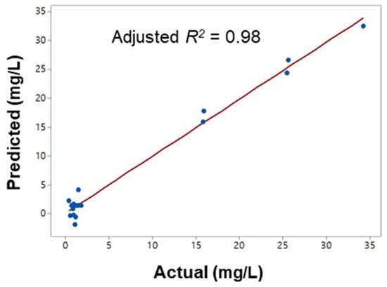 where Ym is the residual [PO4-P], X1 is the coagulant dosage, X2 is the slow mixing duration and X3 is the agitation speed during the slow mixing. This model fit well with the actual data (R2 = 0.916, p = 0.007, Table 4) with no significant lack-of-fit (p > 0.05) and a good agreement between the two datasets (Table 2, Figure 3). Thus, this model (Equation (7)) can be regarded as an adequate estimation of the responses of the independent variables to the dependent variable within the defined region.