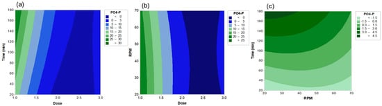 The significance of the model terms was verified using ANOVA (Table 4). Out of the three, only one linear term, D (X1), could be regarded significant (p < 0.05). This result agrees with the contour patterns where Dose is the major driver of the residual [PO4-P] (Figure 4a,b). Conversely, the slope of the contour according to Time (X2) and RPM (X3) variations was only mild (Figure 4c). Except for Dose × Dose, the quadratic and the interaction terms were not statistically significant (p > 0.05), and no clear pattern of interaction was observable from the RSM plots (Figure 4).