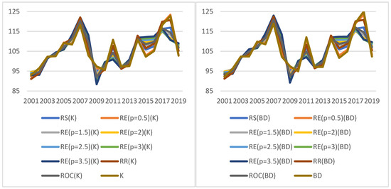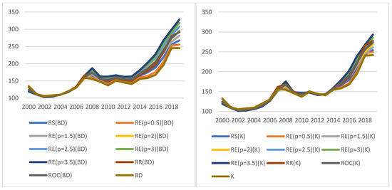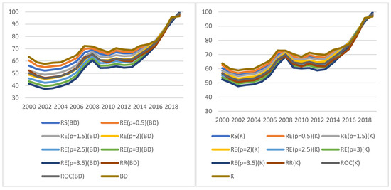 The average KPIs determined by the BD method are almost always (except for 2013 and 2016) higher than those determined by the K method. In both years, this applies to all methods of determining weights. In addition, the KPI median values determined by the K and BD methods were compared (Table 6). It can be noted that, relatively, the smallest difference between the median values of the indicators calculated by the K method and BD occurs for weights determined by the RS method (0.047%), the largest for weights determined by the RE method with parameter p = 3.5 (0.716%). These are not big differences. The differences in median levels are not statistically significant for a significance level of 0.05.