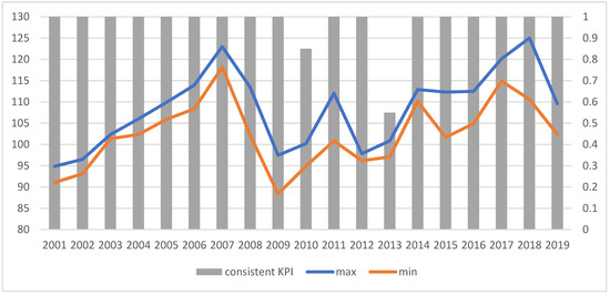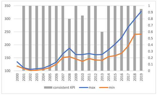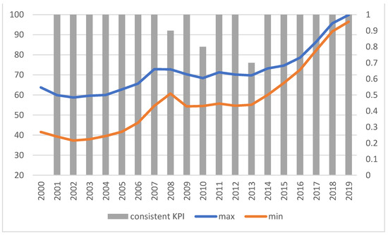 The range of indicator values (left axis) and consistency of results (right axis) for .“Consistent KPIs”—KPIs showing the same direction of change compared to the previous year. Source: authors’ own material based on the GUS data.