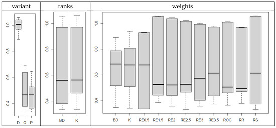 As shown in Table 7, the differences between the maximum and minimum average KPIs, measured by medians, do not exceed 29%. The smallest differences in KPI values between the approaches using BD and K ranks occur for the variant without weights, and the smallest for weights determined by the RE method (with parameter p = 3.5) RR. These differences do not exceed 11%. Differences in median levels are not statistically significant for a significance level of 0.05.