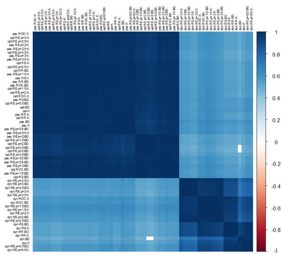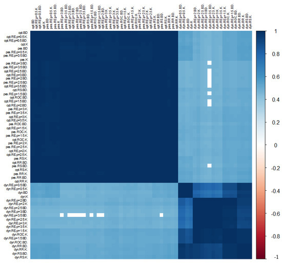 The results obtained for the Spearman rank correlation coefficient are presented in Figure 10. Almost all of the KPIs exhibit statistically significant similarity. The minimum value of the correlation coefficient is 0.4439, while the average is 0.95. The conclusions on the similarity of the approaches confirm those drawn before. The indicators and are again grouped as the most similar. Similarly, in this case, the indicators in the dark fields behave in the same way, so it is possible to choose the one that is the most universal.