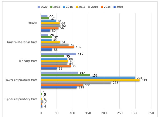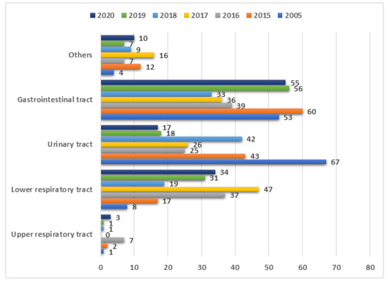 The analysis of the samples collected from 244 PCICU patients from the gastrointestinal tract revealed positive results as follows: 2005—61% (17/28), 2015—40% (28/70), 2016—41% (26/64), 2017—24% (12/51), 2018—41% (13/32), 2019—43% (12/28), and 2020—41% (9/22). A statistically significant difference between the positive and negative results was found in a comparison between 2005 and 2017 (p = 0.0010). The most frequently isolated species in the gastrointestinal tract samples can be found in Figure 9.