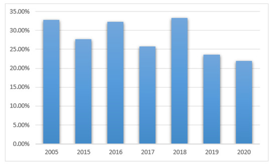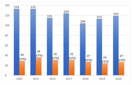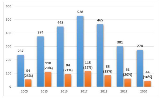 The prevalence of positive results in the studied years was as follows: 2005—33% (15/46), 2015—32% (19/59), 2016—30% (30/101), 2017—30% (46/159), 2018—25% (36/146), 2019—28% (27/97), 2020—25% (15/60), with no statistically significant differences between the results.