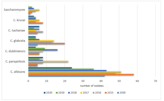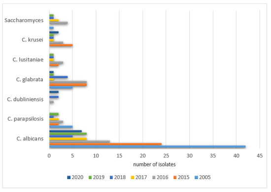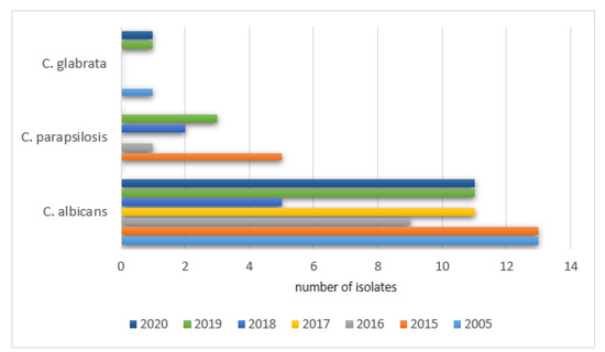 The same was noticed for Candida glabrata: 2005—9% (5/54), 2015—18% (20/110), 2016—14% (13/94), 2017—12% (14/115), 2018—7% (6/85), 2019—6.5% (4/61), 2020—9% (4/44), as well as Candida lusitaniae: 2005—0% (0/54), 2015—4.5% (5/110), 2016—8.5% (8/94), 2017—4% (5/115), 2018—7% (6/85), 2019—5% (3/61), 2020—13.6% (6/44) and Candida krusei was observed: 2005—0% (0/54), 2015—7% (8/110), 2016‚4% (4/94), 2017—5% (6/115), 2018—4.7% (4/85), 2019—6.5% (4/61), 2020—6.8% (3/44).