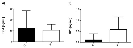 Levels of bisphenols in controls and patients with depression. Serum concentration levels of (A) BPA, (B) BPS were measured in healthy individuals (C) (53 subjects/black bar) and in patients with MDD (P) (14 subjects/white bar).