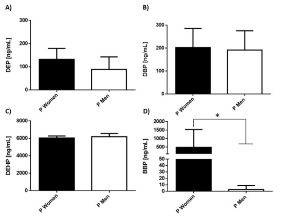 Levels of phthalates in male and female patients with depression. Serum concentration levels of phthalates (A) DEP, (B) DBP, (C) DEHP, (D) BBP were measured in women (9 subjects/black bar) and men (5 subjects/white bar). Bars represent the mean ± S.D. * p < 0.1 was considered statistically significant. In the case of the comparison between C and P groups we found a Mann–Whitney U value of 9.0.