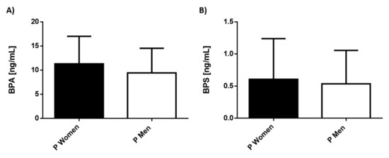 There were no dimorphic differences in bisphenols, and the serum values found were similar in men and women, Figure 4.