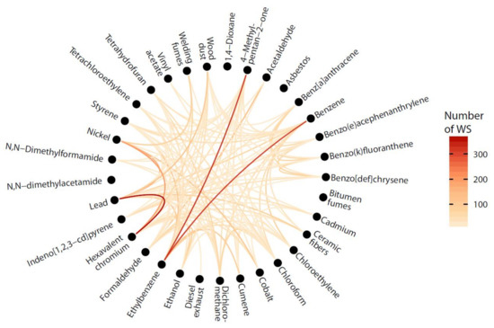 Co-occurrence chart of carcinogen exposures (excluding quartz and cristobalite) displaying co-occurrences with a minimum of 10 WS exposed. Darker shades of colors denote more frequent coexposures.
