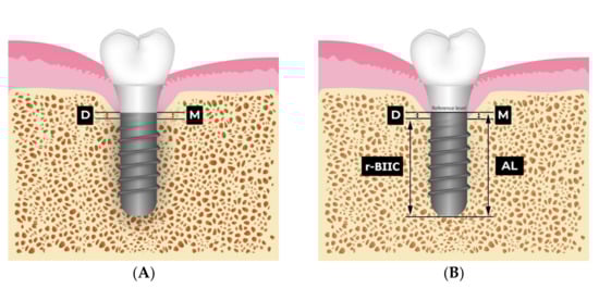 Vector illustration of the non-submerged dental implants (ITI Straumann implant). (A) MBL at mesial (M) and distal (D) sites. (B) AL, actual length of the implant; r-BIIC, radiographic bone-implant interface contact.