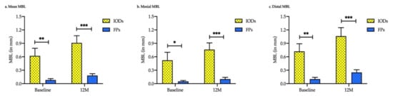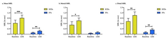 Marginal bone level alteration at baseline and 12-month follow-up after prosthetic delivery of implant-supported fixed protheses (FPs) and implant-retaining overdentures (IODs). (a) Mean MBL; (b) MBL in mesial site; and (c) MBL in distal site. A paired t-test was used. *** p < 0.001, ** p < 0.01 and * p < 0.05.