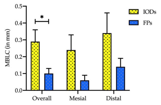 Figure 4 exhibits the changes in MBL between the IOD and FP groups. Overall, the changes in MBL were significantly higher in the IOD group (IOD group: 0.29 ± 0.07 mm; FP group: 0.10 ± 0.03 mm; p = 0.018), whereas the mesial and distal MBL did not reveal any significance.