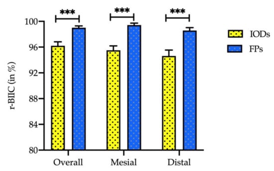 A radiographic bone-implant interface contact (%) analysis was carried out (Figure 5). The mean r-BIIC percentage was significantly higher in the FP group than in the IOD group (p < 0.001). Likewise, the mesial and distal r-BIIC percentages were significantly higher in the FP group than in the IOD group (p < 0.001).