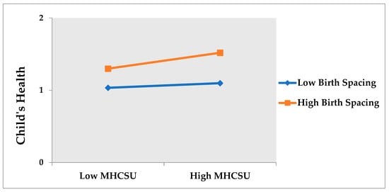 The moderation analysis can be investigated by interacting (multiplying) both the variables, i.e., predictor and moderator. A common and straightforward way of exploring whether a moderating impact occurs involves adding a (regression analysis) interaction term in a multiple regression model. The result endorses the interaction effect of birth spacing on the association between MHCSU and a child’s health. We found a positive and significant interaction between MHCSU and birth spacing on child health (β = 0.236, p < 0.05). We plotted the interaction effects to demonstrate the moderating impact of high and low birth spacing.