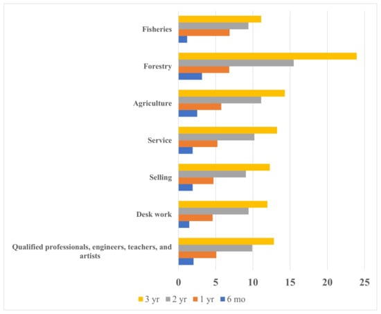 In this study, the number of participants with forestry as the family business may have been too small to inform meaningful conclusions about this group. The number of participants with agriculture (approximately 400 participants) and fisheries (approximately 150 participants) as the family business was sufficient for estimating the incidence and prevalence of AD. However, the small number of participants with a family business of forestry (approximately 100 participants) may have reduced the precision of the estimation. The relatively small number of participants with forestry as their family business may be explained by the decline in the number of forestry workers in Japan in recent years.