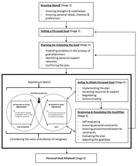 Studies have recognized that self-determination competencies such as goal setting, planning, choice making and self-regulation are applicable to Chinese people [,]. In this regard, the proposed intervention adopts key learning elements from Western self-determination curricula, e.g., [,,], developing a six-stage process of goal pursuit: (1) knowing myself, (2) setting a personal goal, (3) planning for achieving the goal, (4) acting to attain personal goals, (5) reviewing and regulating the goal/plan and (6) personal goal is attained. In stage five, ‘reviewing and regulating the goal/plan’, when there is a need to regulate the goal or the plan, the learners will be facilitated to go back to stage two, ‘setting a personal goal’ or stage three, ‘planning for achieving the goal’ to adjust the goal or the plan accordingly (see Figure 1).