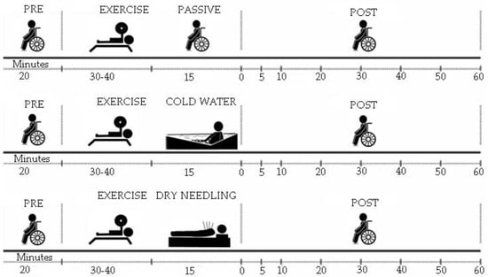The training and evaluation sessions were carried out in a randomized order, once a week, always on the same day and time, interspersed with a seven-day interval. The seven-day interval was implemented firstly to assure complete recovery between sessions and then to adjust for the facility and subjects’ availability (no weekend assessments were allowed). Upon arriving at the gym, individuals were welcomed, oriented and directed to the assessment room, where they remained in rest for 20 min to perform the first blood pressure measurement. The temperature of the evaluation room was controlled throughout the evaluation and maintained between 21 and 24 °C. The adapted bench press is the only device intended for Paralympic Powerlifting, where the athlete who lifts the most weight wins [4]. The strength training (ST) session was preceded by a warm-up similar to that performed before the 1 RM test. The ST consisted of 5 sets of 5 repetitions, with 80–90% of 1 RM [4], interspersed with a 5 min rest interval. After ST, individuals were randomly submitted to the passive recovery (PR), cold-water (CW) and dry needling (DN) methods. After these recovery periods of 15 min, the dependent variable measurements were repeated at minute zero and up to the 60 min post-recovery period.