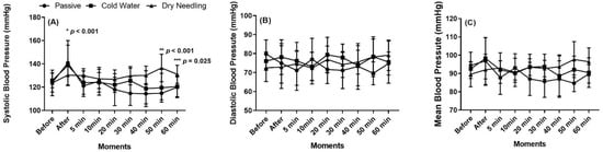 Systolic (A), diastolic (B) and mean (C) blood pressure, before and until 60 min after the training session followed by the three recovery methods. * Difference between dry needling and passive recovery. ** Difference between cold-water and passive recovery. *** Difference between dry needling and passive recovery.