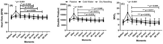 Heart rate (A) in Beats for minutes (BPM), double product (B) and myocardial oxygen (MVO2) (C), before and until 60 min after the training session followed by the passive recovery with the three recovery methods. * Difference between passive recovery, dry needling and cold-water. ** Difference with dry needling between minute 5 and minute 40. *** Difference with dry needling between minute 5 and minute 50. **** Difference with dry needling between minute 5 and minute 60.
