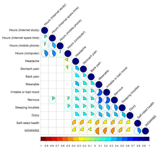 The correlation matrix (Figure 1) show bivariate correlations between all four measures of time spent on the internet (study or spare time), computer, or mobile phone and eight psychosomatic symptoms. Hours refer to hours per day used for various activities, i.e., hours per day for internet use for study purposes. As demonstrated in Figure 1, there was a strong correlation between Hours (computer), Hours (Internet spare time), and Hours (mobile phone). Additionally, self-rated health and WEMWBS scores were also included in the exploratory correlation analysis. Interestingly, no statistically significant correlation could be demonstrated between WEMWBS or self-rated health and hours spent using a computer, the internet, or a mobile phone. Feeling nervous was the only symptom that was correlated with the time spent on the internet in spare time (r = 0.153, 95% CI [0.039, 0.218], p = 0.005). There were two somatic and two psychological symptoms correlated with the number of hours spent on the computer. Headache (r = −0.166, 95% CI [−0.256, −0.079], p < 0.001) and stomach pain (r = −0.088, 95% CI [−0.185, −0.005], p = 0.039) were both positively correlated with computer time. On the other hand, feeling nervous (r = 0.089, 95% CI [0.016, 0.196], p = 0.021) and sleeping troubles (r = 0.125, 95% CI [0.005, 0.186], p = 0.039) had a negative correlation with computer time.