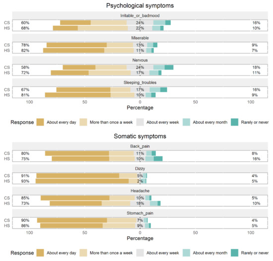 Generally, we can observe a very low frequency of answers representing a low level of reported symptoms, ranging from 4% to 18% (Figure 2). Due to high skewness in the distribution of the results, we grouped Likert scale results in two categories—“more than once per week” and “about every week or less”. Feeling nervous (χ2(1) = 9.50, p = 0.002) and sleeping troubles (χ2(1) = 10.60, p = 0.001) were the two psychological symptoms with statistically significant differences between CS and HS students. On the other hand, for somatic symptoms, CS students reported much more frequent headaches compared to HS students (χ2(1) = 8.52, p = 0.004).