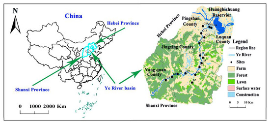 The Ye River is located in the North China Plain. The study area spans from Yangquan County (Shanxi Province) to the Huangbizhuang Reservoir in Pingshan County (Hebei Province). The Ye River basin inclines from southwest to northeast and covers approximately 600 km2, and the total population is about 1.2 million. The study region has a semi-humid and semi-arid monsoon climate, with an average annual precipitation of 500 mm (mostly falling from May to September) and a mean annual temperature of 20 °C [24]. Rainfall was 390.9 mm in 2018, and the rainfall in the rainy season was 344.4 mm. The average flow of Ye River is 7.79 m3/s and 1.95 m3/s in the rainy season and dry season, respectively [25]. The main hydrochemical type of the Ye River is SO4·HCO3-Ca(Mg) [26].