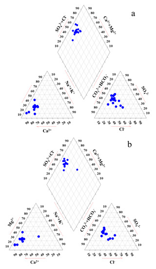 Piper diagram showing the chemical composition of the groundwater in the dry (a) and flood (b) season.