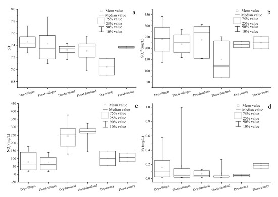 In the Ye River area, temporal variations in the groundwater quality are likely to be mainly influenced by rainfall. As shown in Figure 3, no obvious temporal variation in pH was detected in the villages and farmland region (Figure 3a), which is likely because pH can be affected by multiple factors [36]. However, in the county region, pH in the flood season was slightly higher than in the flood season. The mean SO42− and Fe concentrations were higher in the dry season than in the flood season (except for Fe in the county region) (Figure 3b,d), which may be closely related to the dilution effect of rainfall [37]. However, the mean NO3− concentration in the farmland area in the flood season was marginally higher than that in the dry season (Figure 3c). This may be due to the fact that rainfall runoff carries large amounts of agricultural fertilizer, which infiltrates the groundwater.