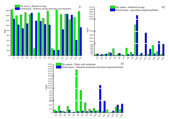 Figure 4 shows the mean contributions (mg/L) of three sources at 16 sampling sites based on the output of the PMF model. In addition, Table 5 summarized the main characteristics of each site. On the whole, the mean contribution of domestic sewage and industrial sewage to 16 sampling sites in the dry season (1489 and 322.5 mg/L) was higher than that in the flood season (1158 and 273.6 mg/L), which is mainly due to the dilution of excessive rainfall in the flood season (Figure 4S1) [18]. The contribution rate of domestic sewage during the dry and flood season was higher in the village sites (1646 and 1277 mg/L) than that in farmland sites (1589 and 1155 mg/L) and county sites (1398 and 873.2 mg/L), which may be due to the domestic sewage substandard emissions in the village region. However, the spatial variation at different land use patterns in the dry and flood season showed that the contribution rate of industrial sewage in village sites (404.2 and 384.4 mg/L) was higher than that in county sites (245.4 and 220.0 mg/L) and farmland sites (147.3 and 95.6 mg/L). In addition, in the dry season, the mean contribution of water–rock interaction at 16 sites was higher in the village sites (810.8 mg/L) than that of the county (116.6 mg/L) and farmland sites (115.5 mg/L). The mean contribution of agricultural nonpoint pollution at 16 sites in the flood season in the farmland sites (970.5 mg/L) was higher than that in the village sites (880.5 mg/L) and county sites (379.0 mg/L). It is noteworthy that the highest contribution of agricultural nonpoint pollution and urban nonpoint pollution was from site 10 (agricultural area) and site 11 (county area) (6903 and 3103 mg/L), respectively. This was closely related to the excessive application of chemical fertilizer in agricultural areas and the heavy traffic in urban areas.