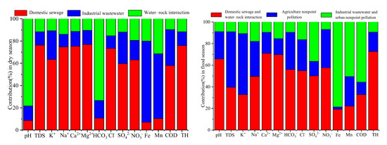 In the flood season, water-quality parameters were affected by domestic sewage and water–rock interaction (65.7% of pH, 49.7% of Na+, 70.9% of Ca2+, 69.7% of Mg2+, 50.1% of SO42−, 57.6% of NO3−, 54.9% of Cl−, 56.0% of HCO3−, 72.7% of TH, 39.6% of TDS, and 32.8% of K+), agricultural nonpoint pollution (51.4% of TDS, 56.5% of K+, and 35.5% of NO3−), and industrial wastewater and urban nonpoint pollution (78.6% of Fe, 50.5% of Mn, 55.7% of COD, and 36.5% of SO42−).