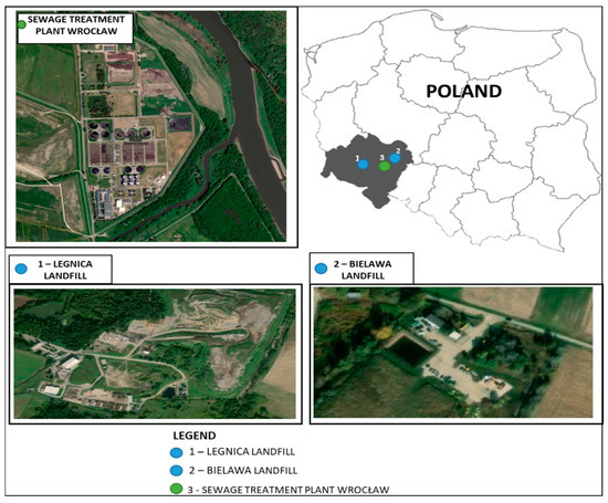Two municipal waste landfills, located in Lower Silesia Voivodship, at different stages of operation, were selected for the study. The first one, not exploited, is located in Bielawa (geographical coordinates 51°9′21.485″ N, 17°14′18.03″ E). The facility was in operation since 2001, for a period of 10 years. Its area is 0.86 ha and its capacity is 37.8 thousand m3.