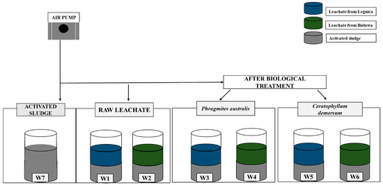 Scheme of conducted experiment with activated sludge mixed with: raw leachate samples from Legnica (W1) and Bielawa (W2), leachate samples after treatment with P. australis from Legnica (W3) and Bielawa (W4), leachate samples after treatment with C. demersum from Legnica (W5) and Bielawa (W6). W7—control sample (activated sludge).