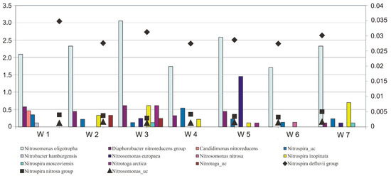 An important role in wastewater treatment plants is attributed to the bacteria that carry out the basic process of biological nitrogen removal i.e., nitrification. Nitrification was conventionally classified as a two-stage process. In the first stage, bacteria oxidize ammonium nitrogen (N-NH4) to nitrite nitrogen (N-NO2) (ammonia oxidizing bacteria -AOB), the second stage is carried out by bacteria (NOB) oxidizing nitrite nitrogen (N-NO2) to nitrate nitrogen (N-NO3) [16]. From a phylogenetic perspective, five types of AOB bacteria are classified as Nitrosomonas, Nitrosolobus, Nitrosovibrio, Nitrosospira and Nitrosococcus and as NOB bacteria as Nitrobacter, Nitrospina and Nitrococcus [17]. However, this division into two groups was challenged when a new nitrification process, commamox (COMplete AMMonium OXidation) was discovered by bacteria of the genus Nitrospira [18], which are capable of carrying out both stages of nitrification, i.e., they encode oxidation pathways for both ammonia and nitrite [19].