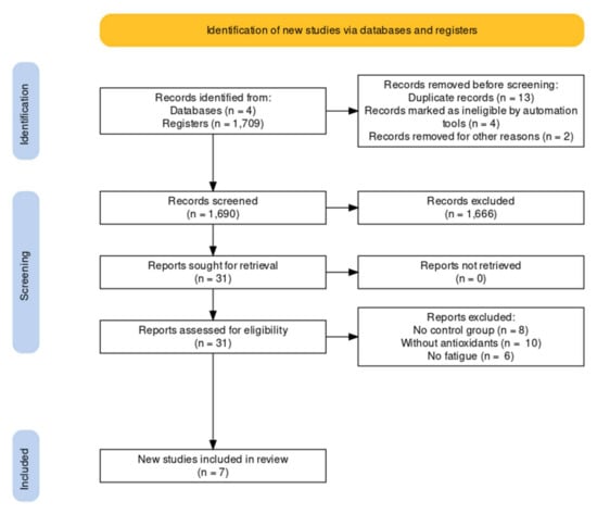 The database search identified a total of 1709 articles. After duplicate studies were eliminated, 1690 remained. In each case, the title and abstract were evaluated according to their relevance to the review criteria. Studies that were duplicates, those for which the full text was not available, those carried out with animals, those not related to the search and those based on subjects who had a pathology or injury at the time of the study were all eliminated. After applying these criteria, 31 articles remained. However, in eight there was no control group, in another ten no antioxidant was consumed, and in another seven the state of fatigue did not result from physical exertion. Finally, therefore, seven articles were selected for inclusion in this systematic review (Figure 1).