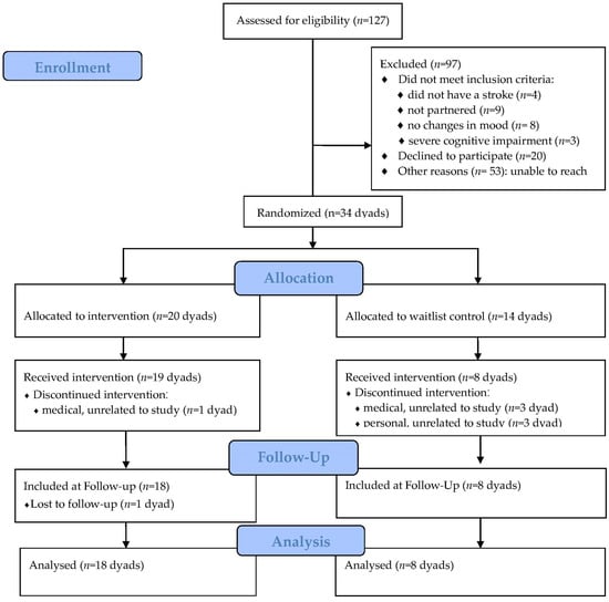 Consistent with recommendations for pilot study sample sizes [25], the target sample size for the planned analysis was 24 dyads; a target total sample size of 34 dyads was planned to account for attrition. This sample size was expected to be sufficient to demonstrate proof-of-concept as long as changes were in the expected direction. Participant dyads consisted of one partner who had a stroke at least 3 months prior to enrolling in the study and a partner or spouse. Participants were recruited through referrals from University of Utah-affiliated outpatient rehabilitation and neurology clinics and in-person at community-based events. Dyads meeting the following criteria were eligible: (1) 18 years of age or older; (2) living together for at least 6 months; (3) community-dwelling; and (4) either one or both partner(s) had to report changes in mood (depressed mood and/or anhedonia) since the stroke as assessed by self-report on the 2-item Patient Health Questionnaire [26]. A clinical diagnosis of depression was not required. Dyads were excluded if: (1) they were unable to understand printed English instructions, (2) either partner did not want to participate, (3) the care partner had a history of stroke or other major neurologic condition, and/or (4) the person with stroke had significant cognitive impairment or aphasia that would interfere with meaningful participation in the intervention. Although individuals with severe cognitive impairment and/or aphasia were excluded, those with mild–moderate cognitive impairment (assessed using the Montreal Cognitive Assessment (MoCA) [27] or the Cognitive Assessment for Stroke Patients (CASP) [28]) and/or expressive aphasia were included in the study to increase generalizability to a stroke population [29,30]. The University of Utah Institutional Review Board approved all study procedures prior to recruitment and data collection. All participants provided their own written informed consent.