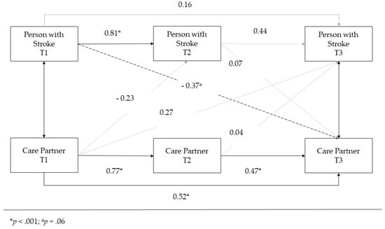 There were no significant partner effects, i.e., neither partner’s PROMIS-D-SF scores were significantly associated with the other partner’s scores. However, there was near significance (p < 0.06) for PROMIS-D-SF scores of the individual with stroke at T1 predicting PROMIS-D-SF scores of the care partner at T3, with higher scores for individuals with stroke at T1 predicting lower care partner scores at T3. The indirect pathways through T2 scores were not significant.
