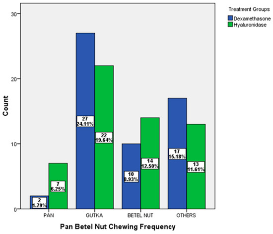 All patients (100%) habitually chewed pan, gutka, and betel nut, both alone and together. Gutka chewing was the predominant habit in both treatment groups. Both groups showed a statistically insignificant difference (p = 0.213) with respect to deleterious habits (Figure 1).