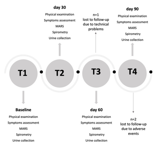 Sixty children were screened for eligibility. Fifty children enrolled at T1 (baseline visit) attended follow-up examinations at T2 (day 30), T3 (day 60) and T4 (day 90) (Figure 1). All children were treated with inhaled corticosteroids (ICS) at a stable dose for at least 8 weeks and during the whole study period and were provided with a mobile app (DragONE) [22], available in Italian in both iOS and Android environments, for daily recording of diurnal and nocturnal cough and wheezing, blocked nose and reliever medication use. The study was approved by the local Institutional Ethics Committee (n. 02/2017), and informed consent was obtained from all parents of each child prior to study entry. All children agreed to take part in the study, which was conducted in accordance with Good Clinical Practice and the Declaration of Helsinki.