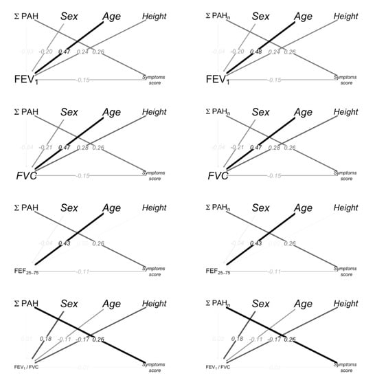The path diagrams for spirometry parameters, PAHs, age, sex (Female vs Male) and height are shown in Figure 2; the color intensity and the width of the arrows are proportional to the magnitude of the effects. The path from PAHs to FEV1 through a symptom score indicates the indirect effects. Sex (Female vs. Male), height and age had a significant direct effect on FEV1.