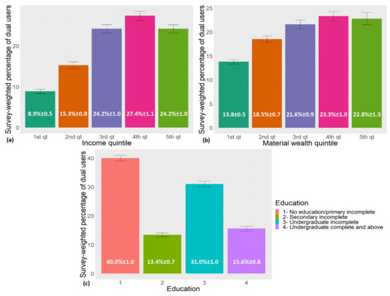 Survey weighted distribution of dual use across (a) income, (b) material wealth, and (c) educational attainment including standard errors.