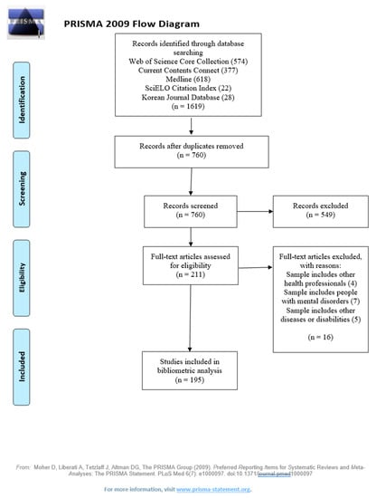 Scientific journals are the main means of validating new knowledge and disseminating it within the research community and to society and its agents [15]. Bibliometric analyses are increasingly used in the medical sciences because they facilitate the evaluation of published scientific research results and analysis of both scientific productivity on a given topic and the impact of research on a specific topic in terms of visibility, trends and future inquiry. However, few such bibliometric studies were conducted in the field of nursing and psychiatry [16,17], although nursing is one of the health professions that can make the greatest contribution to the treatment and recovery of individuals suffering from mental illness.