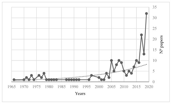 Based on the search strategy, a total of 1619 documents were obtained. After inclusion and exclusion criteria were applied, 195 were selected for the final part of this study because they fit the study topic. The selected articles were published between 1966 and 2019. Figure 2 show the temporal evolution of scientific production. The number of studies published annually on this topic was low and remained practically constant until 2005, after which the number of publications began to increase, achieving a highly significant increase in the final five years.