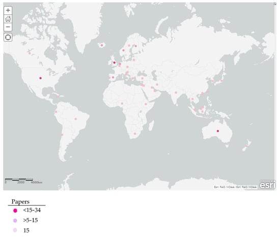 The selected studies were published by 248 institutions from 46 countries. The countries with the most studies published were the United States and Australia, with 31 studies, followed by England with 17 (Figure 4).