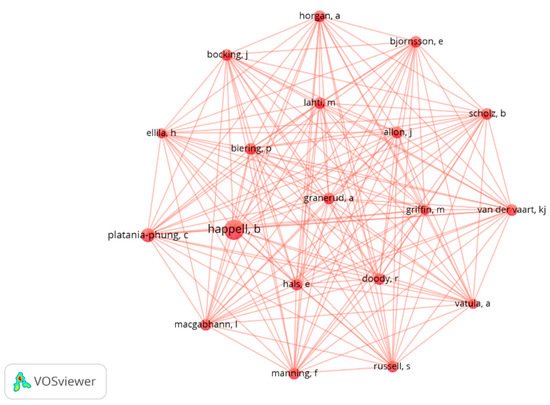 A single cluster appears made up of researchers with five or more documents published per year. Of the total number of authors of the articles analyzed, these are 19 authors who present scientific collaborations in a relatively stable way. The total strength of the links of most of them is similar (108-88) (Table 1). Greater size and proximity between the nodes representing Berta Happell and Cris Platania Phung is observed (Figure 5).