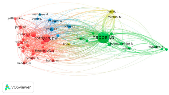Analysis of a co-citation map reveals the most influential authors on a specific topic and the closeness of the research topics [28]. We identified two main clusters. The largest cluster is formed mainly by authors affiliated with large research groups. In particular, Corrigan P.W. and Link B.G. are psychologists affiliated with research groups on stigma in the US. Thornicroft G. and Angermeyer M.C. are psychiatrists who belong to research groups on stigma in the UK and Germany, respectively. These authors have researched stigma since the 1990s and have investigated the stigma process and the consequences for persons suffering from stigma. In addition, they have developed a theoretical framework to generate an operational definition and allow for the quantification of this phenomenon [5,29]. The most co-cited author in this study, Brenda Happell, belongs to the next largest cluster. This author has collaborated in research groups from various Australian universities, with one of her main lines of research being lived-experience participation in nurse education [30].