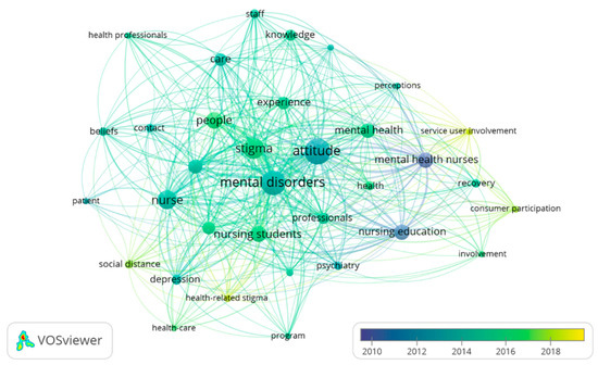 The 485 keywords were grouped according to the strength of occurrences. The keywords with the most co-occurrences were “attitude”, with 74, “mental disorders”, with 69, “stigma”, with 50 and “nurse”, with 40. Observing the variation in keywords by year revealed that in the final 10 years, “stigma” and “nursing students” were the most commonly used keywords, and since 2017, the keywords “consumer participation” and “health-related stigma” have been predominantly used. “Service user involvement” appeared as a prominent keyword in 2018 (Figure 7).
