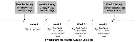 The Step Count Challenge is a bi-annual challenge run in the spring (May—eight weeks) and autumn (October—four weeks) each year in Scotland (https://www.stepcount.org.uk). The current study reports on the 2018 autumn challenge. The challenge is delivered through an online platform where teams of five employees with a nominated captain sign up at a cost of GBP 30 (USD ±40) per team. Each team member has their own profile page and dashboard where they can enter steps, monitor weekly step goals, and communicate with their team. They can also see their team members progress and how the overall teams’ steps compare with the wider challenge communities. For those who choose to take part in non-walking activities (e.g., cycling, swimming, running were other options for the 2018 challenges) the website gives you the opportunity to convert these into steps and add it towards your total. For example, for cycling a 1:4 ratio is used with four miles of cycling equating to one mile of walking. For this challenge 93% of all activities recorded were walking, 4% cycling, 2% running and 1% swimming. After the first week of the challenge where no step goal was set, individual step goals increased by an additional 1500 steps per day based on their week 1 step counts for the following 3 weeks with the aim to reach this goal on 3 days in week 2 and then 5 days in weeks 3 and 4 (Figure 1). Additional motivation was provided through daily emails with information on the individuals step counts and goal progress, weekly blogs and competitions including photo competitions, and step count champion awards with merchandise and vouchers presented to winners.