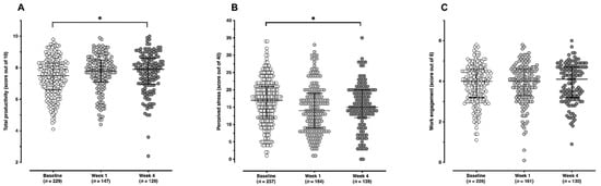 Work-related outcomes (A) total productivity, (B) perceived stress, (C) work engagement at each time point (baseline, week 1 and week 4). * p < 0.001. Total productivity is further broken down into its six subscales in Figure 4.