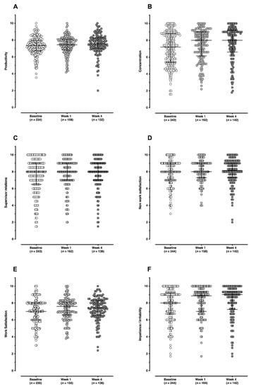 Six subscales that form the total productivity score at each time point (baseline, week 1 and week 4). Productivity (A), concentration (B), supervisor relations (C), non-work satisfaction (D), work satisfaction (E), impatience/irritability (F). Scores closer to 10 indicate desirable work productivity outcomes. Changes in subscales were not assessed with formal statistical testing.