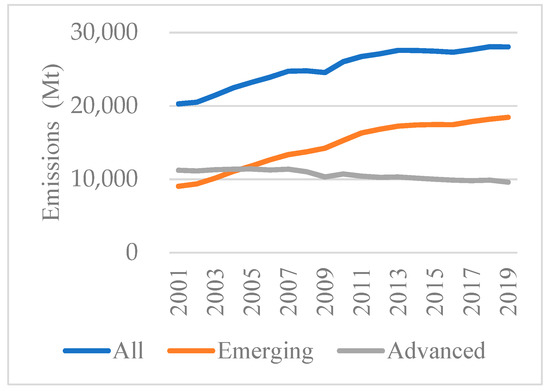 Although crises can obviously mitigate CO2 emissions, this effect is very short-lived [57]. Economic activities, including large government investment and growing consumptions, were main drivers for CO2 emissions after 2008 in emerging countries. On the contrary, advanced economies preferred a low-carbon lifestyle after the crisis [58]. From the production-based aspect, advanced economies’ reliance on imports was reduced, thus mitigating CO2 emissions that are implied in international trade [59]. Thus, although the historical stock of CO2 emissions is mainly attributed to advanced economies, it is the emerging economies that have been responsible for the most emissions currently. Therefore, a balance should be coordinated between advanced and emerging economies [60].